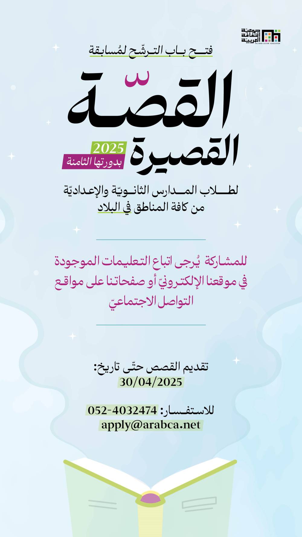 {"id":3614,"title":"\u0641\u062a\u062d \u0628\u0627\u0628 \u0627\u0644\u062a\u0631\u0634\u0651\u062d \u0644\u0645\u0633\u0627\u0628\u0642\u0629 \u0627\u0644\u0642\u0635\u0629 \u0627\u0644\u0642\u0635\u064a\u0631\u0629 \u0644\u0639\u0627\u0645 2020","body":"\u0641\u062a\u062d \u0628\u0627\u0628 \u0627\u0644\u062a\u0631\u0634\u0651\u062d \u0644\u0645\u0633\u0627\u0628\u0642\u0629 \u0627\u0644\u0642\u0635\u0629 \u0627\u0644\u0642\u0635\u064a\u0631\u0629 \u0644\u0639\u0627\u0645 2020 \u0644\u0637\u0644\u0627\u0628 \u0627\u0644\u0645\u062f\u0627\u0631\u0633\r\n\r\n\u062a\u064f\u0639\u0644\u0646 \u062c\u0645\u0639\u064a\u0651\u0629 \u0627\u0644\u062b\u0642\u0627\u0641\u0629 \u0627\u0644\u0639\u0631\u0628\u064a\u0651\u0629 \u0639\u0646 \u0641\u062a\u062d \u0628\u0627\u0628 \u0627\u0644\u062a\u0631\u0634\u0651\u062d \u0644\u0645\u0633\u0627\u0628\u0642\u0629 \u0627\u0644\u0642\u0635\u0629 \u0627\u0644\u0642\u0635\u064a\u0631\u0629 \u0644\u0637\u0644\u0627\u0628 \u0627\u0644\u0645\u062f\u0627\u0631\u0633 \u0627\u0644\u0625\u0639\u062f\u0627\u062f\u064a\u0651\u0629 \u0648\u0627<span class=\"text_exposed_show\">\u0644\u062b\u0627\u0646\u0648\u064a\u0651\u0629. \u062a\u064f\u0646\u0638\u0651\u0645 \u0647\u0630\u0647 \u0627\u0644\u0645\u0633\u0627\u0628\u0642\u0629 \u0644\u0644\u0633\u0646\u0629 \u0627\u0644\u062b\u0627\u0644\u062b\u0629 \u0639\u0644\u0649 \u0627\u0644\u062a\u0648\u0627\u0644\u064a\u060c \u0625\u0630 \u0634\u0627\u0631\u0643 \u0627\u0644\u0633\u0646\u0629 \u0627\u0644\u0645\u0627\u0636\u064a\u0629 150 \u0645\u0634\u0627\u0631\u0643\/\u0629 \u0641\u064a \u0627\u0644\u0645\u0633\u0627\u0628\u0642\u0629.<\/span>\r\n<div class=\"text_exposed_show\">\r\n\r\n\u064a\u064f\u0631\u062c\u0649 \u0645\u0646 \u0627\u0644\u0631\u0627\u063a\u0628\u064a\u0646\/\u0627\u062a \u0628\u0627\u0644\u0645\u0634\u0627\u0631\u0643\u0629 \u0641\u064a \u0627\u0644\u0645\u0633\u0627\u0628\u0642\u0629\u060c \u062a\u0642\u062f\u064a\u0645 \u0642\u0635\u0651\u0629 \u0642\u0635\u064a\u0631\u0629 \u0628\u0627\u0644\u0644\u063a\u0629 \u0627\u0644\u0639\u0631\u0628\u064a\u0651\u0629 \u0645\u0646 \u062a\u0623\u0644\u064a\u0641 \u0627\u0644\u0645\u0634\u0627\u0631\u0643\/\u0629\u060c \u0639\u0644\u0649 \u0623\u0646 \u062a\u0643\u0648\u0646 \u0627\u0644\u0642\u0635\u0651\u0629 \u063a\u064a\u0631 \u0645\u0646\u0634\u0648\u0631\u0629 \u0633\u0627\u0628\u0642\u064b\u0627. \u0644\u0644\u0637\u0627\u0644\u0628\u0627\u062a \u0648\u0627\u0644\u0637\u0644\u0627\u0628 \u062d\u0631\u064a\u0651\u0629 \u0627\u062e\u062a\u064a\u0627\u0631 \u0645\u0648\u0636\u0648\u0639 \u0627\u0644\u0642\u0635\u0651\u0629.\r\n\r\n\u0644\u0644\u0645\u0634\u0627\u0631\u0643\u0629 \u064a\u064f\u0631\u062c\u0649 \u062a\u0639\u0628\u0626\u0629 \u0627\u0644\u0642\u0635\u0651\u0629 (\u062d\u062f \u0623\u0642\u0635\u0649 1500 \u0643\u0644\u0645\u0629) \u062f\u0627\u062e\u0644 \u0627\u0644\u0627\u0633\u062a\u0645\u0627\u0631\u0629 \u0627\u0644\u0625\u0644\u0643\u062a\u0631\u0648\u0646\u064a\u0651\u0629:\r\n\r\n<a href=\"https:\/\/docs.google.com\/forms\/d\/e\/1FAIpQLScTW8tnVdSuC41Pv1nRhMxs1io04FVvtLXcgIWE8ZoSlKn5kQ\/viewform?vc=0&c=0&w=1&fbclid=IwAR3CkOb0Pc-z8dhTZ-UshKUw1CTsr9uFxW6jyOUJMd9-varDU39PRmzG_3Q\" target=\"_blank\" rel=\"noopener nofollow noreferrer\" data-ft=\"{"tn":"-U"}\" data-lynx-mode=\"async\" data-lynx-uri=\"https:\/\/l.facebook.com\/l.php?u=https%3A%2F%2Fdocs.google.com%2Fforms%2Fd%2Fe%2F1FAIpQLScTW8tnVdSuC41Pv1nRhMxs1io04FVvtLXcgIWE8ZoSlKn5kQ%2Fviewform%3Fvc%3D0%26c%3D0%26w%3D1%26fbclid%3DIwAR3CkOb0Pc-z8dhTZ-UshKUw1CTsr9uFxW6jyOUJMd9-varDU39PRmzG_3Q&h=AT3WBwsVyr05KLXwJq_FOxpCLU9EvSgrSkpjPVtosiOL3iyOuqwbKhpHftkvrK4ZX00PmOlu6GWmXQENLmEDxrHYlzXUCeUcZwvIh9ED48UpCatfty1zcFG0PuOZA7jvcpqgtEg2JZE3P0S5ROO29LbyZ-lrF4rPLZ-Gf9SJkD7AeuDy_OJ7ViI1vbP11zTzw-RMfb1GZK3ZN2OGG9GF02YxEwM9x9ckInNMZuWy6sTZi5q9Xc2TBPZOZlEDuNaolS1Q2Nianq3GLBBYTL5xD2oCCozgZFN53m28CQM70faBqnMlH5DUu3yHX7yI-Zh4KbIfGZhAvGTwnZ9OBEWVCduYaupnOgDoa58vOi77bDzvy80lRIL9Gf4_ohxGrD-PvsOAWMoS9Sb3_b9XeADaY8qi2ZLyZfGfJXXpVZHDSEnkwWFm8rtOK9mHHKtuuLZ6bik4O8VgrlrCvBr_KB4Y2yIaryTpP35Nb7pACpov3HKHMa-bc-VWU9SOfI1VZpP_d34UnUorLS6zlNfrfqBb2_SSU3wLBXKLiLL7k_Aml2TtY8bdeTaMQLxhZrm_7bVpVg-Ki3oFMuAZBIR5EJjZ4LFcj5khWi-T-rLt2HcjuulCcK3z-QDNAYv8d-A\">https:\/\/docs.google.com\/\u2026\/1FAIpQLScTW8tnVdSuC41Pv\u2026\/viewform\u2026<\/a>\r\n\r\n*\u0622\u062e\u0631 \u064a\u0648\u0645 \u0644\u0644\u0645\u0634\u0627\u0631\u0643\u0629 29 \u0634\u0628\u0627\u0637 \/ \u0641\u0628\u0631\u0627\u064a\u0631 2020.\r\n\r\n**\u0644\u0644\u0627\u0633\u062a\u0641\u0633\u0627\u0631:\r\napply@arabca.net\r\n046082352\r\n\r\n<a class=\"_58cn\" href=\"https:\/\/www.facebook.com\/hashtag\/%D9%85%D8%B3%D8%A7%D8%A8%D9%82%D8%A9_%D8%A7%D9%84%D9%82%D8%B5%D8%A9_%D8%A7%D9%84%D9%82%D8%B5%D9%8A%D8%B1%D8%A9?source=feed_text&epa=HASHTAG&__xts__%5B0%5D=68.ARB5Owe68iAgkcuJTw_QsYoMqMQhAmrdNx7olxQ_od-yzjzRYqVMEztsCsDQsRaDznOfMsqm6JZR6EVyOiTPFr-hzut4WwWqMM1jo4TLcOC9cnSR3sIep1JmSDlh--RNzTo1WcDYhxFjb4YmxegpaoY2jgGTaA4Ql185xG2DtUeIYEzr0lpBqfNGehGEz6v0hojQSS4-OKaLH1f0BNA-bHjo60nAzFO8wL_-_8sRXcwr5iF6ZwLo1vVCo4FEcU6lpc0M1_0SKKw1VoTVPnDk9KKl4T3RuDB2werjzYKJP3fqSzIl8g5aD5yFbsIXOP5KyHRRulGNqX_EF2ILFJI&__tn__=%2ANKH-R\" data-ft=\"{"type":104,"tn":"*N"}\"><span class=\"_5afy\"><span class=\"_58cl _5afz\" aria-label=\"hashtag\">#<\/span><span class=\"_58cm\">\u0645\u0633\u0627\u0628\u0642\u0629_\u0627\u0644\u0642\u0635\u0629_\u0627\u0644\u0642\u0635\u064a\u0631\u0629<\/span><\/span><\/a>\r\n<a class=\"_58cn\" href=\"https:\/\/www.facebook.com\/hashtag\/%D8%AC%D9%85%D8%B9%D9%8A%D8%A9_%D8%A7%D9%84%D8%AB%D9%82%D8%A7%D9%81%D8%A9_%D8%A7%D9%84%D8%B9%D8%B1%D8%A8%D9%8A%D8%A9?source=feed_text&epa=HASHTAG&__xts__%5B0%5D=68.ARB5Owe68iAgkcuJTw_QsYoMqMQhAmrdNx7olxQ_od-yzjzRYqVMEztsCsDQsRaDznOfMsqm6JZR6EVyOiTPFr-hzut4WwWqMM1jo4TLcOC9cnSR3sIep1JmSDlh--RNzTo1WcDYhxFjb4YmxegpaoY2jgGTaA4Ql185xG2DtUeIYEzr0lpBqfNGehGEz6v0hojQSS4-OKaLH1f0BNA-bHjo60nAzFO8wL_-_8sRXcwr5iF6ZwLo1vVCo4FEcU6lpc0M1_0SKKw1VoTVPnDk9KKl4T3RuDB2werjzYKJP3fqSzIl8g5aD5yFbsIXOP5KyHRRulGNqX_EF2ILFJI&__tn__=%2ANKH-R\" d