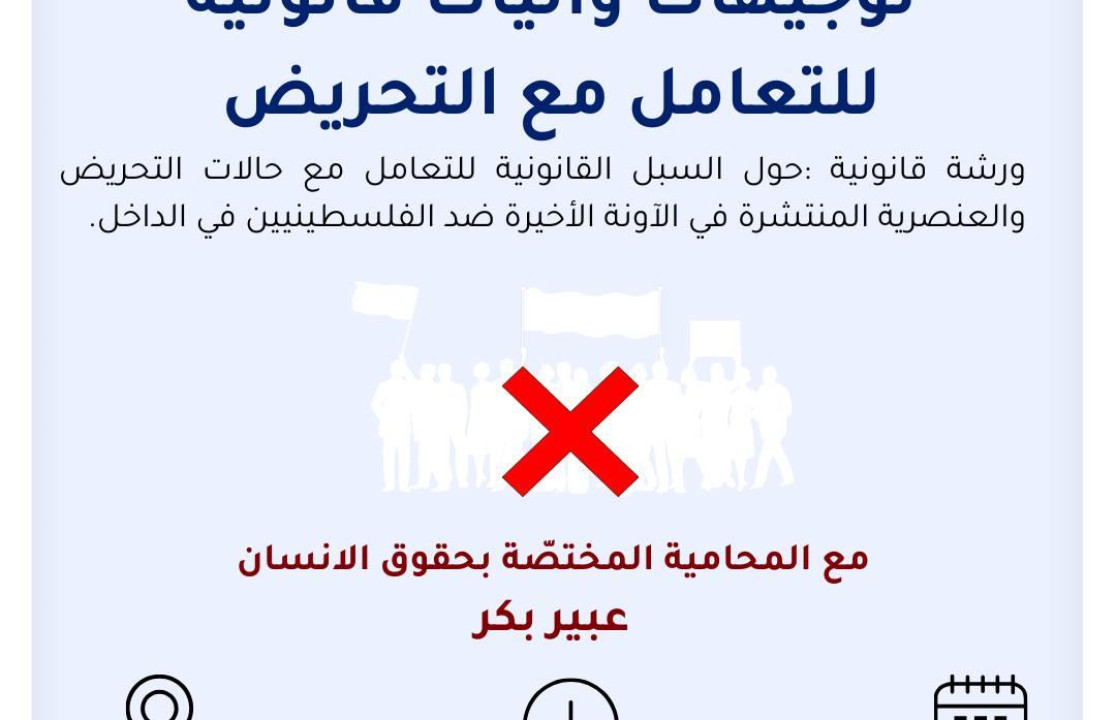 ورشة تحت عنوان "توجيهات وآليات قانونية للتعامل مع التحريض" مع المحامية المختصة بحقوق الانسان عبير بكر نظمتها جمعية الثقافة العربية في تاريخ 15/11/2023 تطرقت الورشة الى توضيح السبل القانونية للتعامل مع حالات التحريض والعنصرية المنتشرة في الآونة الأخيرة ضد الفلسطينيين في الداخل.