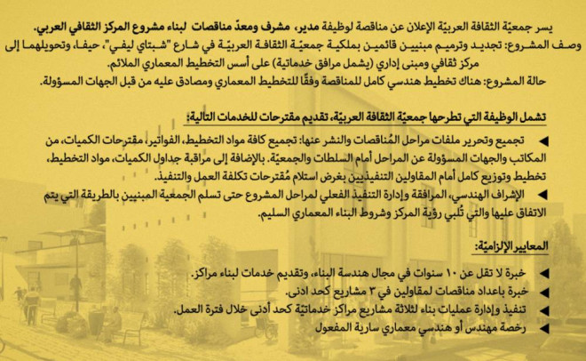 الإعلان عن مناقصة وظيفة مُدير، مُشرف ومعدّ مناقصات لبناء مشروع المركز الثقافي العربي