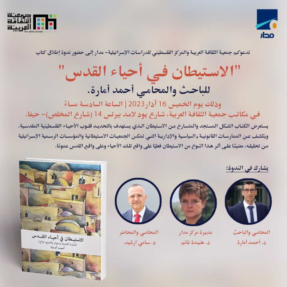 تدعوكم جمعية الثقافة العربية والمركز الفلسطيني للدراسات الإسرائيلية- مدار إلى حضور ندوة إطلاق كتاب "الاستيطان في أحياء القدس"، للباحث والمحامي أحمد أمارة. وذلك يوم الخميس 16 آذار 2023 الساعة السادسة مساءً في مكاتب جمعية الثقافة العربية، شارع يود لامد بيرتس 14 (شارع المخلص)- حيفا.