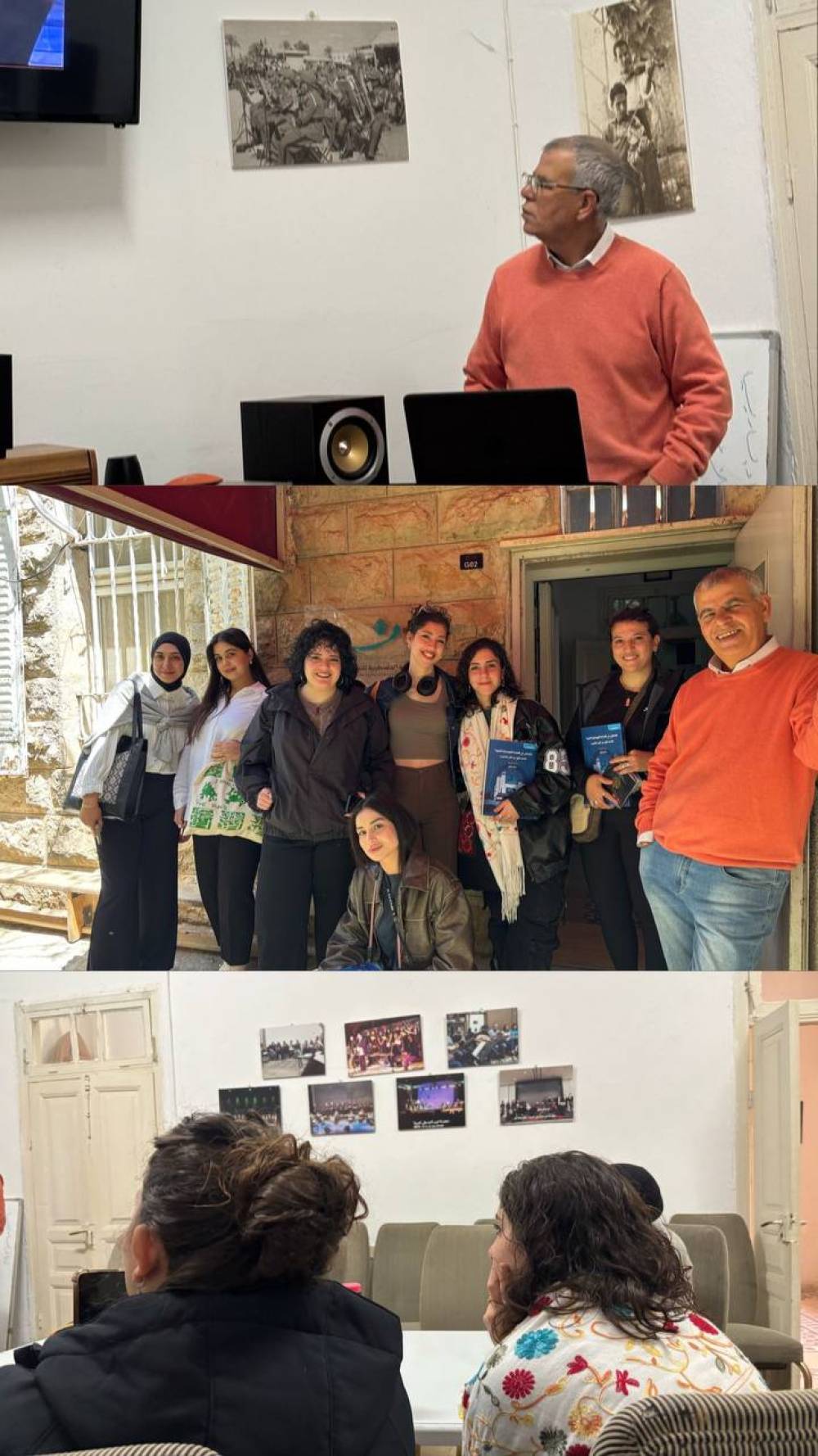 وفي اليوم الثالث، زار الطلاب جمعية نوى للثقافة والفنون، حيث قدّم الباحث نادر جلال قراءة في تاريخ الموسيقى الكلاسيكية الفلسطينية ما قبل النكبة، وتحدّث عن التحديات في توثيق هذا الإرث الثقافي، وسط تغييب للمشهد الفني الفلسطيني، وهيمنة السردية الفلكلورية فقط.
