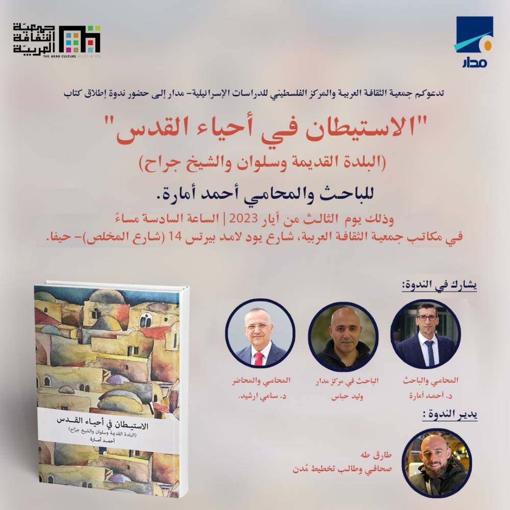 تدعوكم جمعيّة الثّقافة العربيّة والمركز الفلسطيني للدراسات الإسرائيليّة- مدار إلى حضور ندوة إطلاق كتاب "الاستيطان في أحياء القدس – البلدة القديمة، سلوان والشيخ جراح"، للباحث والمحامي أحمد أمارة. وذلك يوم الأربعاء 03 أيار 2023 الساعة السادسة مساءً في مكاتب جمعية الثقافة العربية، شارع يود لامد بيرتس 14 (شارع المخلص) - حيفا.