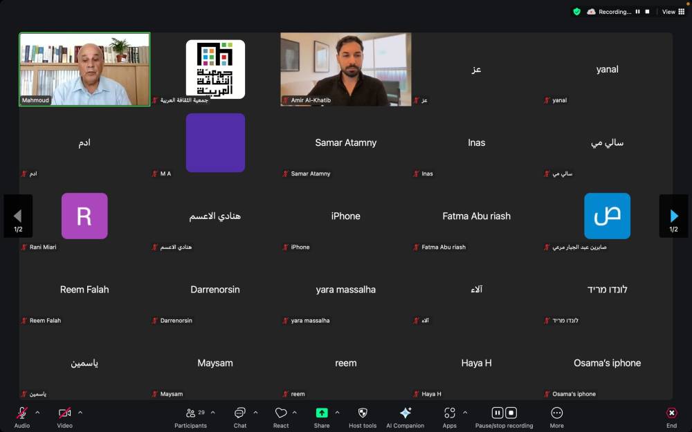 استمرارًا لمشروع “في رواية الإبادة” الذي أطلقته جمعيّة الثقافة العربيّة في كانون الأوّل 2024، استضافت الجمعيّة، يوم الإثنين 2 حزيران 2025، لقاءً حواريًا بعنوان “حرب الإبادة على غزّة وتهجير الفلسطينيين”، بمشاركة الباحث الفلسطيني البارز د. محمود محارب، أستاذ الدراسات الإسرائيلية في جامعة القدس، المتخصّص في السياسات الصهيونية والتاريخ الفلسطيني المعاصر، والصحافي ومقدّم البرامج الحوارية أمير الخطيب.