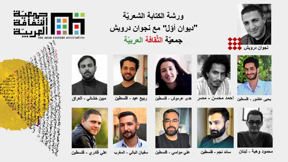 اختتمت جمعيّة الثّقافة العربيّة مؤخرًا، ورشة في الكتابة الشعريّة تحت عنوان "ديوان أوّل" قدّمها الشاعر الفلسطيني ورئيس تحرير القسم الثقافي في صحيفة "العربي الجديد" نجوان درويش على مدار اثني عشر لقاءً، توزعت على مدار ثمانية شهور، بمشاركة مجموعة من الشعراء الفلسطينيين والعرب عبر منصّة زووم.