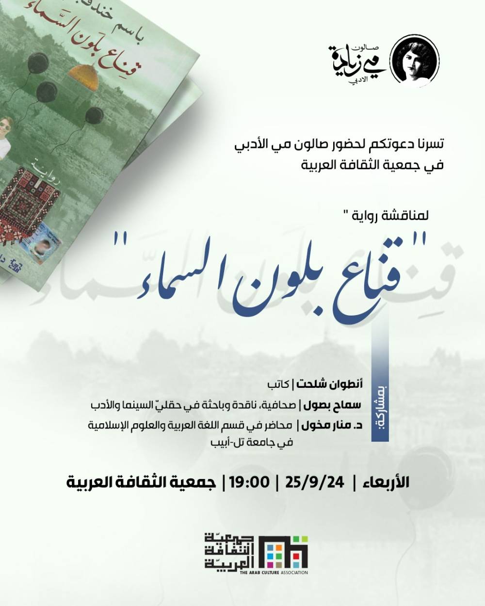 تسرّنا دعوتكم لحضور صالون مي الأدبيّ في جمعيّة الثّقافة العربيّة لمناقشة رواية "قناع بلون السّماء" للكاتب الأسير باسم خندقجي، وظاهرة أدب السّجون في الأدب العربيّ المٌعاصر. حيث يهدف هذا اللقاء الأدبيّ إلى تسليط الضوء على الأبعاد الإنسانيّة والفنيّة لأدب السّجون، ودوره في توثيق التّجارب الإنسانيّة وتحدّي الظّروف القاسية في الأسر.