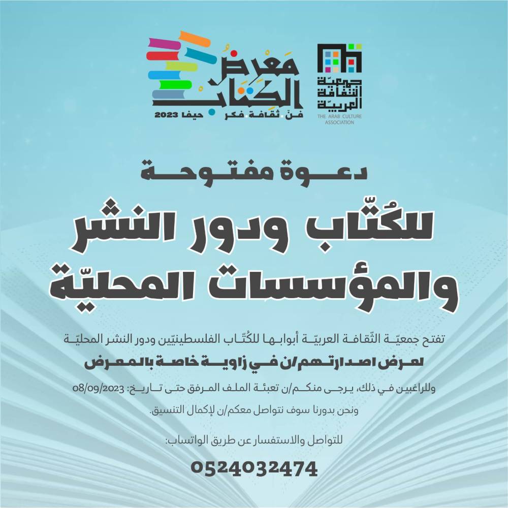 حيث يفتح معرض حيفا للكتاب أبوابه للجمهور للإطلاع على آلاف الكتب العربيةالصادرة في فلسطين والعالم العربي وإمكانية اقتنائها، وذلك من يوم الخميس 14/09/2023 حتى الجمعة 22/09/2023 في المركز الثقافي العربي التابع لجمعيّة الثقافة العربيّة فيمدينة حيفا (شارع "شبتاي ليفي" 7 ) للتواصل والاستفسار يمكنكم/نّ الإتصال مع هاتف الجمعية من خلال واتساب : 0524032474 - من الاثنين حتى الجمعة 09:00 – 17:00