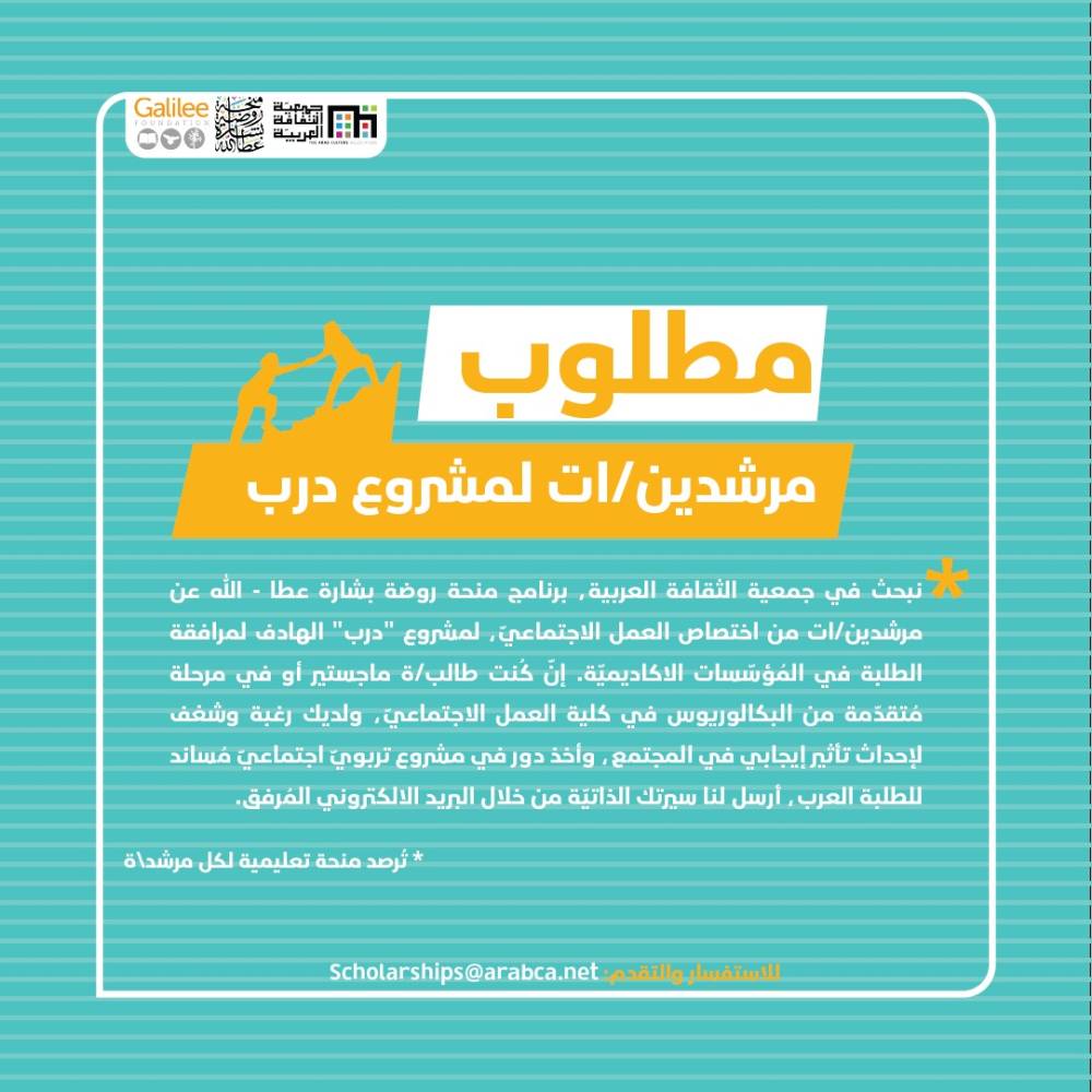 نبحث في جمعية الثقافة العربية، برنامج منحة روضة بشارة عطا - الله عن مرشدين/ات من اختصاص العمل الاجتماعيّ، لمشروع "درب" الهادف لمرافقة الطلبة في المُؤسّسات الاكاديميّة.