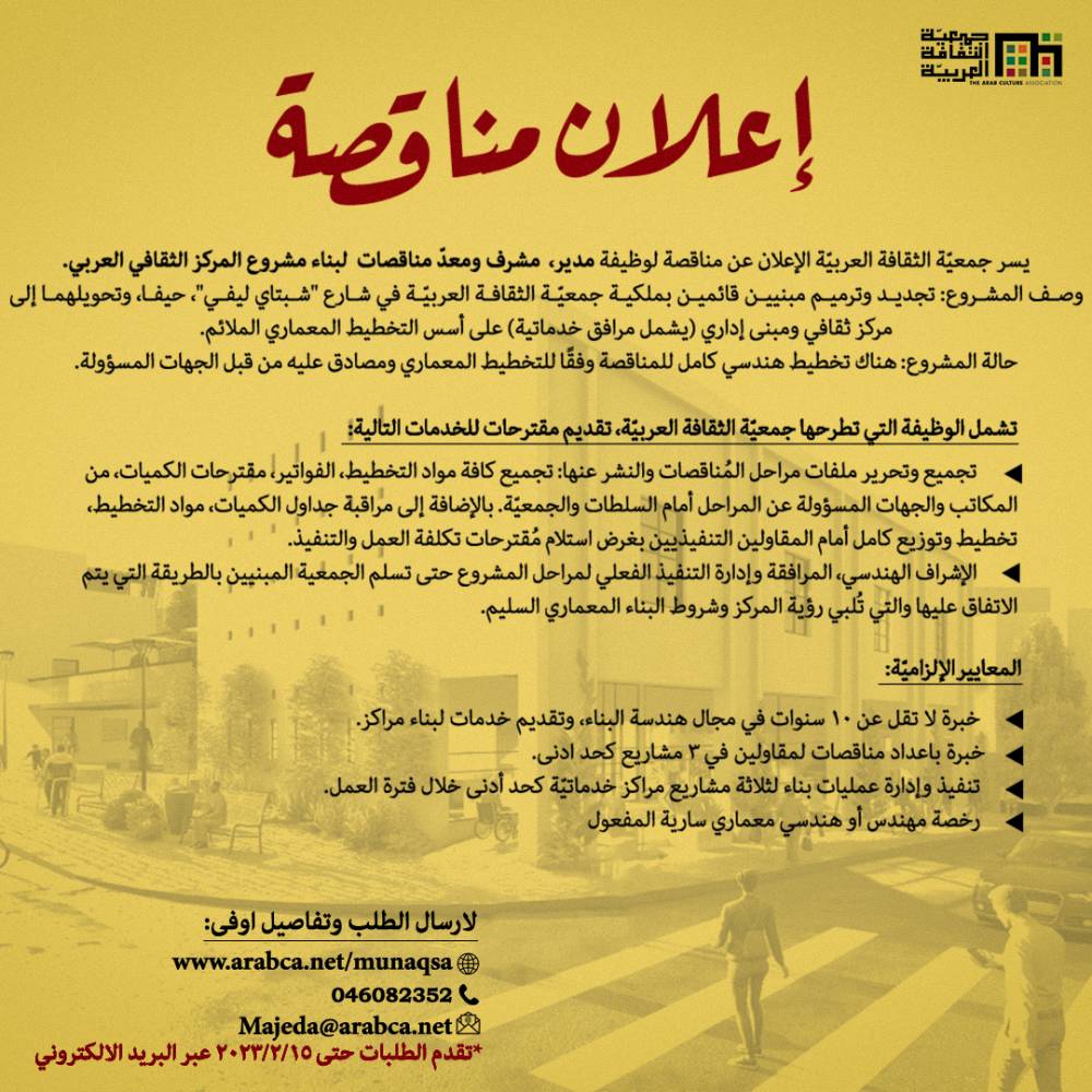 يسر جمعيّة الثقافة العربيّة الإعلان عن مناقصة لوظيفة مدير، مشرف ومعدّ مناقصات لبناء مشروع المركز الثقافي العربي.